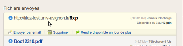 Vous pouvez également allonger la durée de mise à disposition d’un fichier en cliquant sur "Rendre disponible un jour de plus" (un jour par clic, dans une limite fixée par l’administrateur).