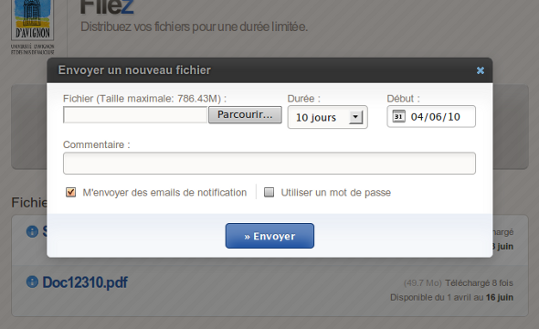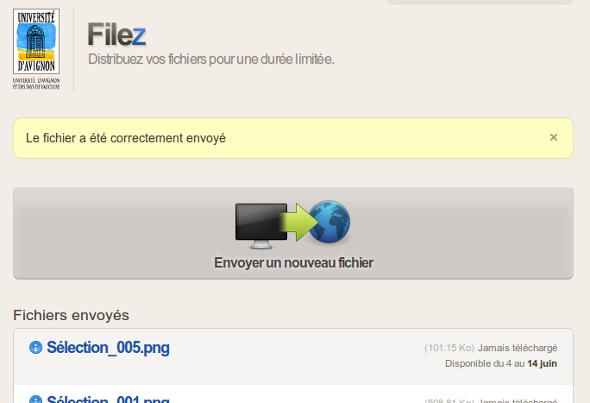 Les fichiers déposés resteront visibles sur cette page pendant la durée de vie que vous aurez définie lors du dépôt.